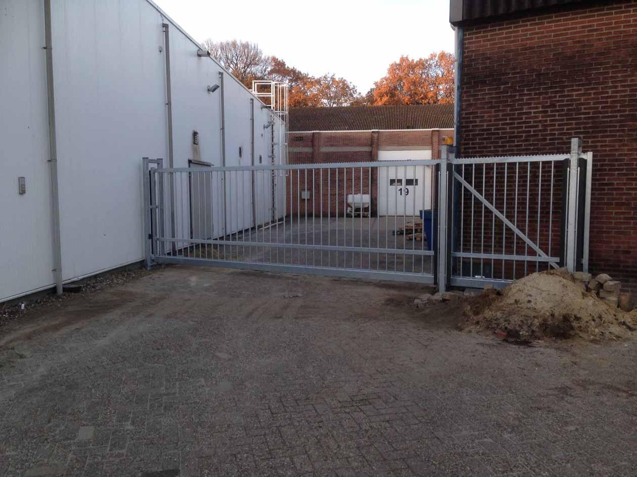 De doorgang 6 meter, vanwege het vrachtwagen verkeer monteert Hoving Hekwerk een Lus in de straat. Men kan dan door het benaderen van de lus de poort openen.
