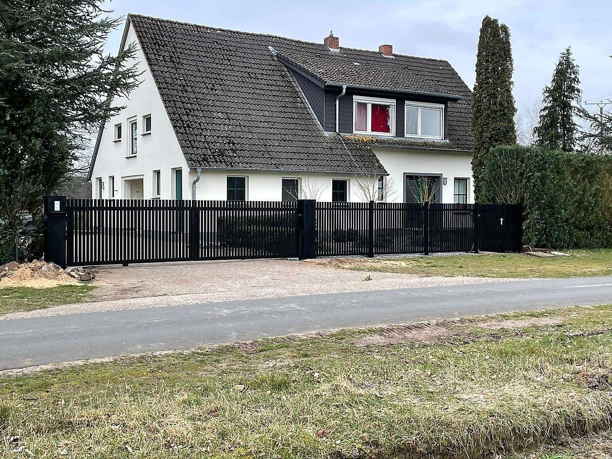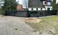 Een Dubbele draaipoort met lamellenvulling, inclusief een looppoortje en hekwerk in dezelfde uitvoering.