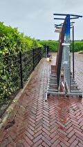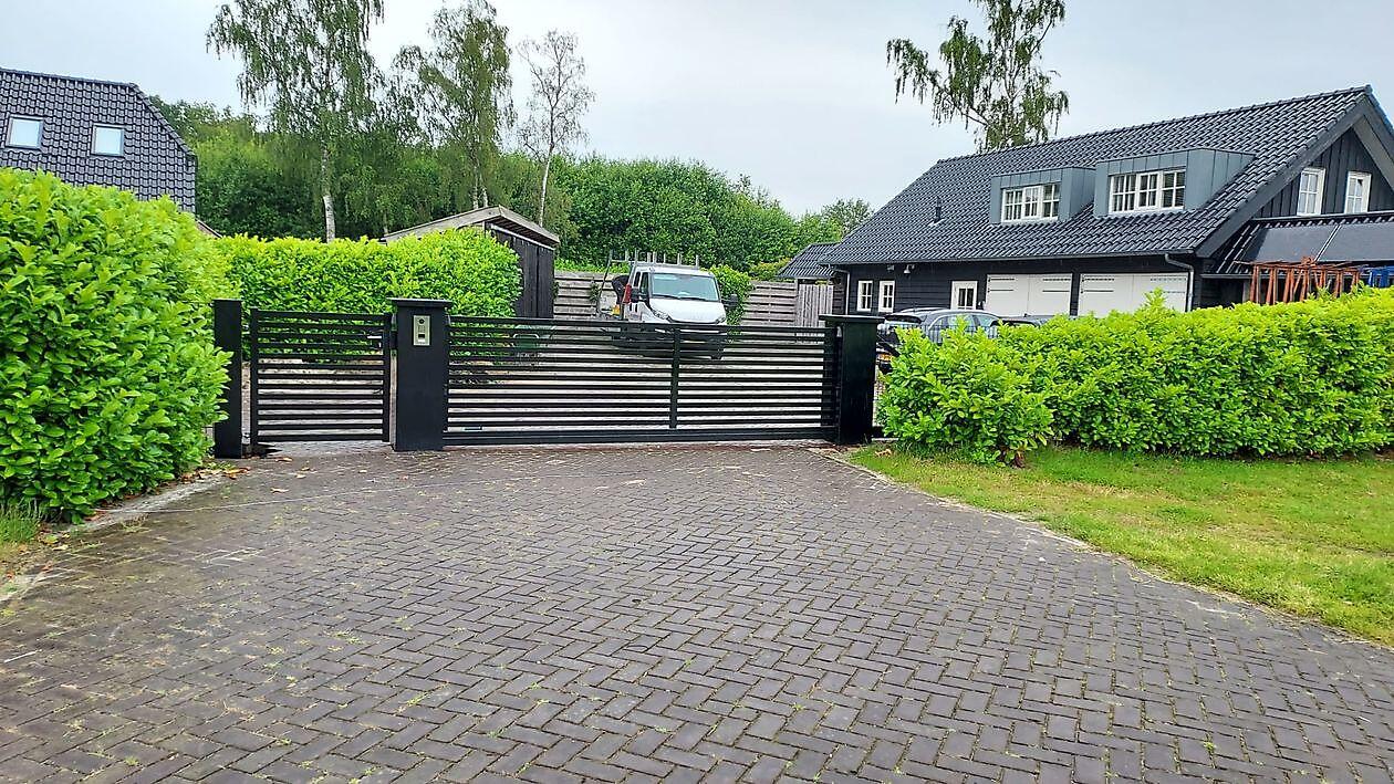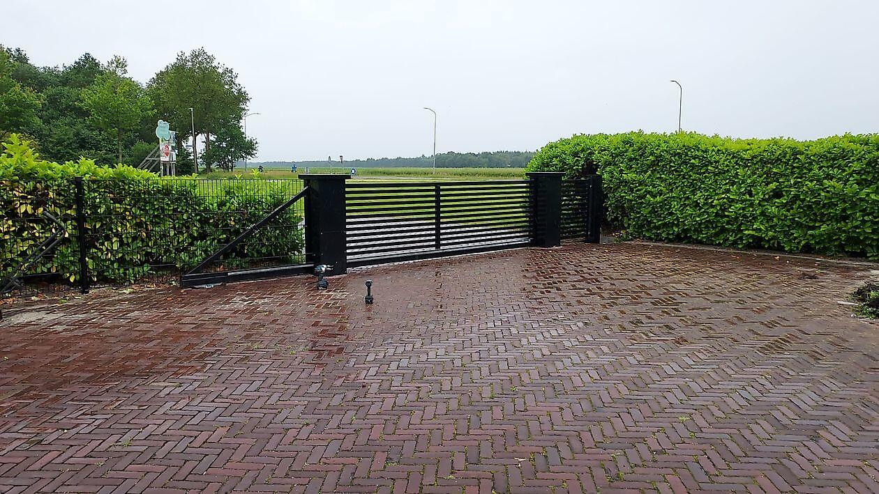 De schuifpoort is uitgevoerd met groter, robuuste kolommen.