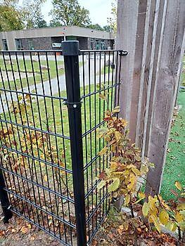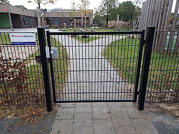 1,2m hoog Dubbelstaafmat hekwerk, inclusief een poortje met een kindvriendelijke draaiknop.