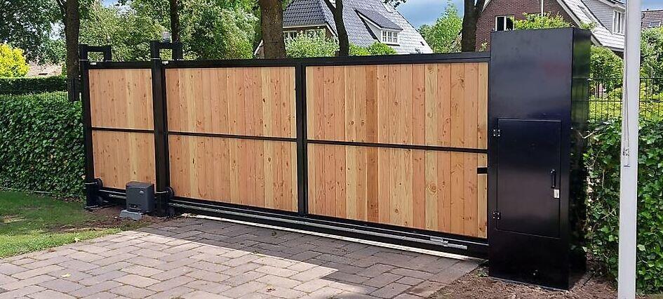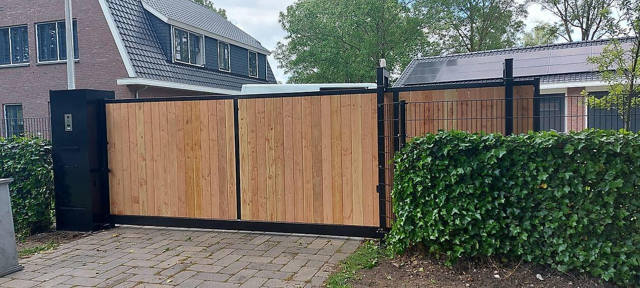 Ook heeft deze poort een Intercom en is de eindzuil uitgevoerd met een brievenbus inworp en een pakket post ingang.